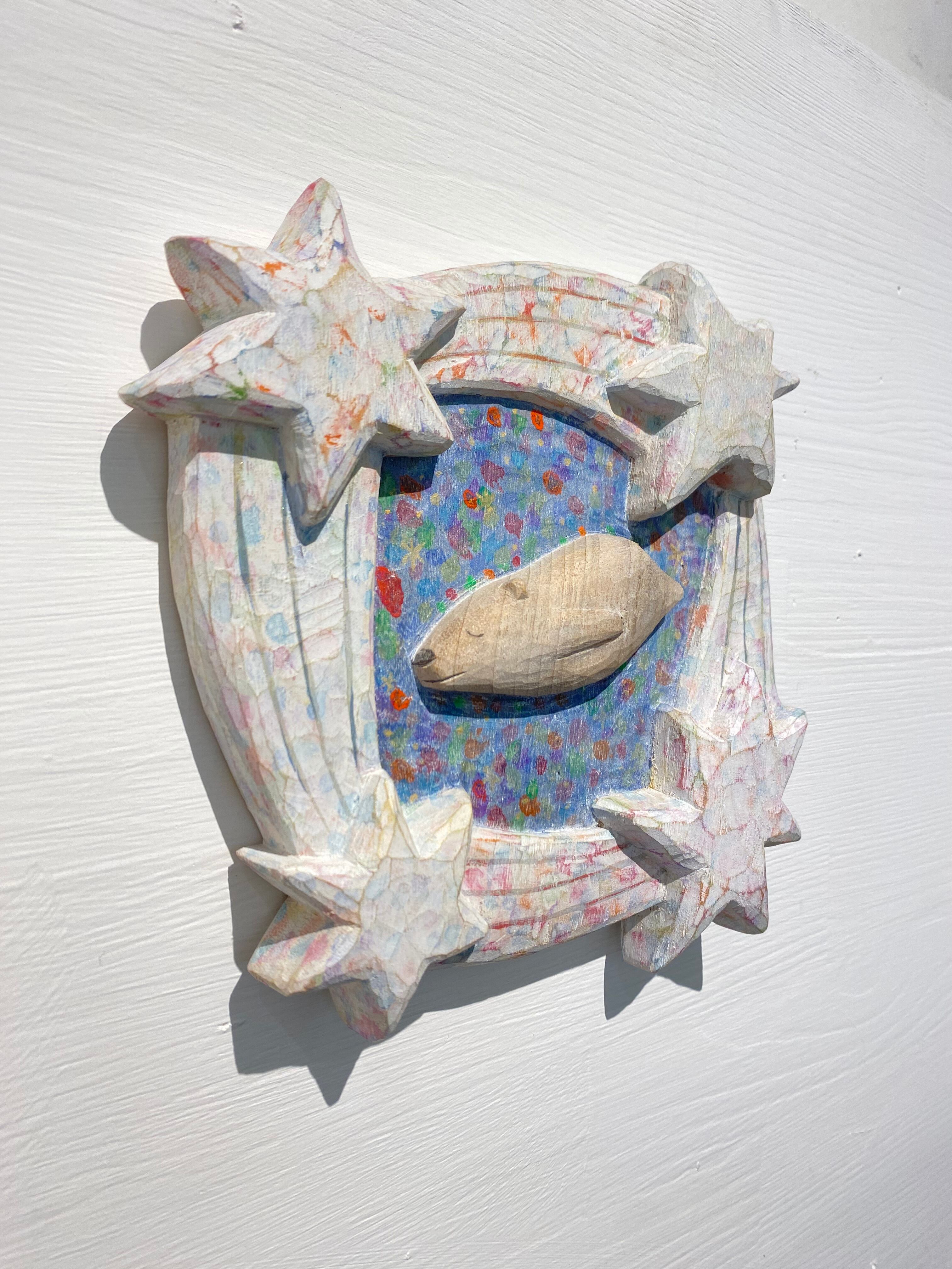 レリーフ 作品になります。楠材に着色をして仕上げています。しろくまが夜空を気持ちよさそうにお散歩している様子を表現しました。周りは流れ星をイメージして作っています。壁掛けの作品なので、絵画のように飾れてお家のインテリアとして楽しめます。
